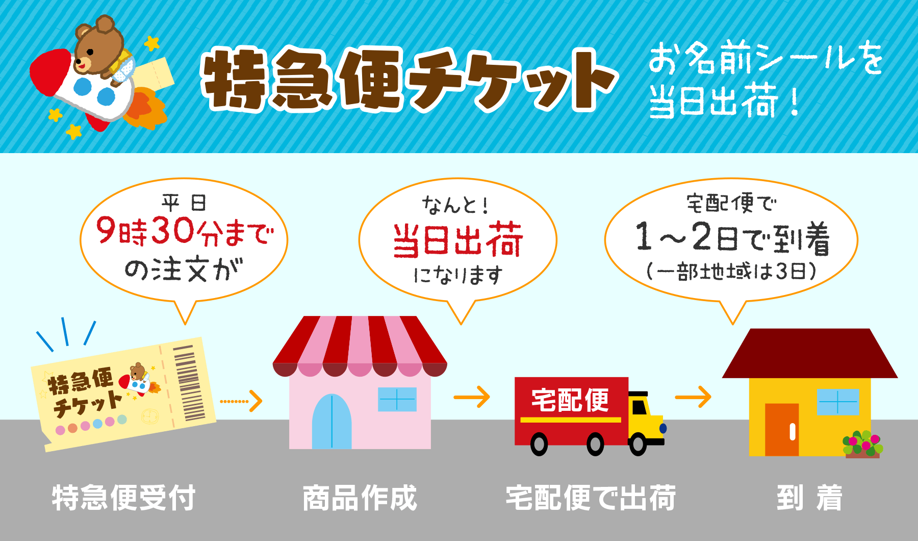 オーダーメイドですが、お名前シールはご注文翌日より1〜2営業日で出荷。