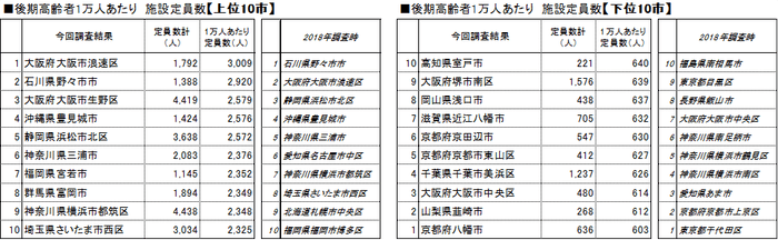 ~ビッグデータで見る 「全国970市区部 高齢者1万人あたりの施設定員数」~ 上位の大阪市浪速区、石川県野々市市は3年前と変わらず 下位10市区は大きく変動し、最下位は京都府八幡市