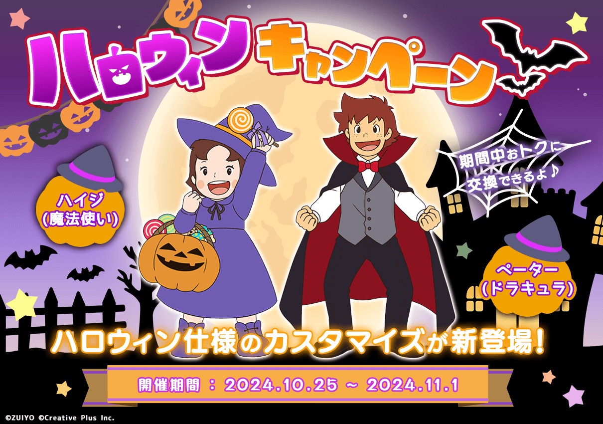 ポイ活アプリ『アルプスの少女ハイジ とくとくウォーキング』 ハロウィンキャンペーン本日より開催! ハロウィン仕様のカスタマイズが新登場!