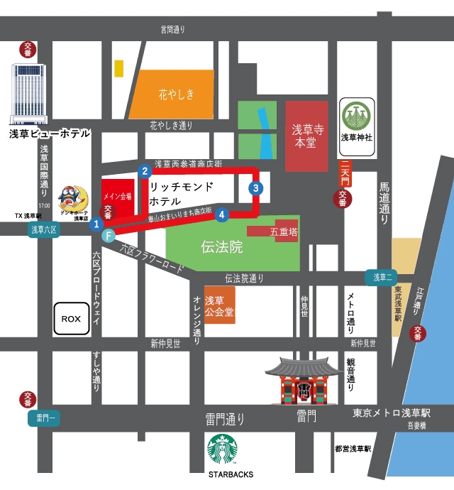 新仲見世通り→オレンジ通り→雷門通り→観音通り・メトロ通り→