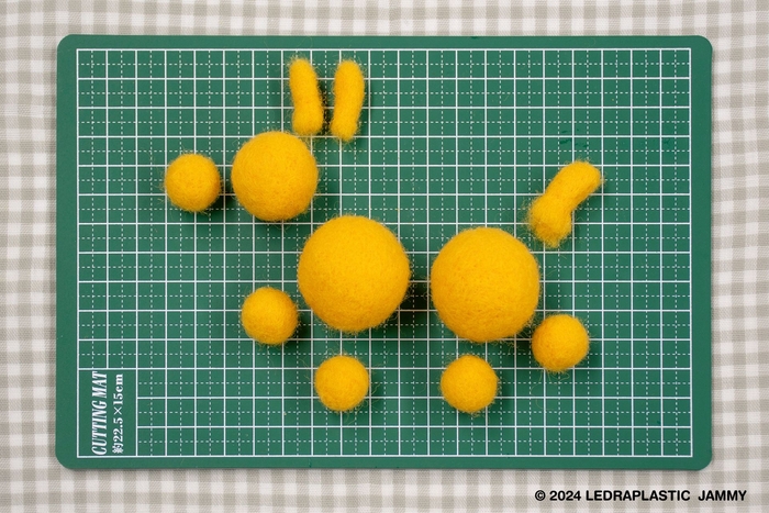 パーツ各種(体、頭、鼻、耳、しっぽ、足)を準備します。裁断した羊毛フェルトを同梱のニードルで刺し固めて、まるく成形していきます。