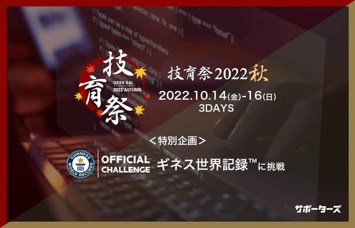株式会社CARTA HOLDINGSのグループ会社で、キャリア支援事業を展開する株式会社サポーターズ(東京都渋谷区、代表取締役:楓 博光)は、エンジニア学生向けテックカンファレンス「技育祭2022【秋】」を、10月14日から3日間にわたって、オンラインにて開催いたします。今回が5回目の開催となり、エンジニア学生約3,000名が参加する見込みの国内最大級(サポーターズ調べ、2022年8月時点)のテックカンファレンスとなります。