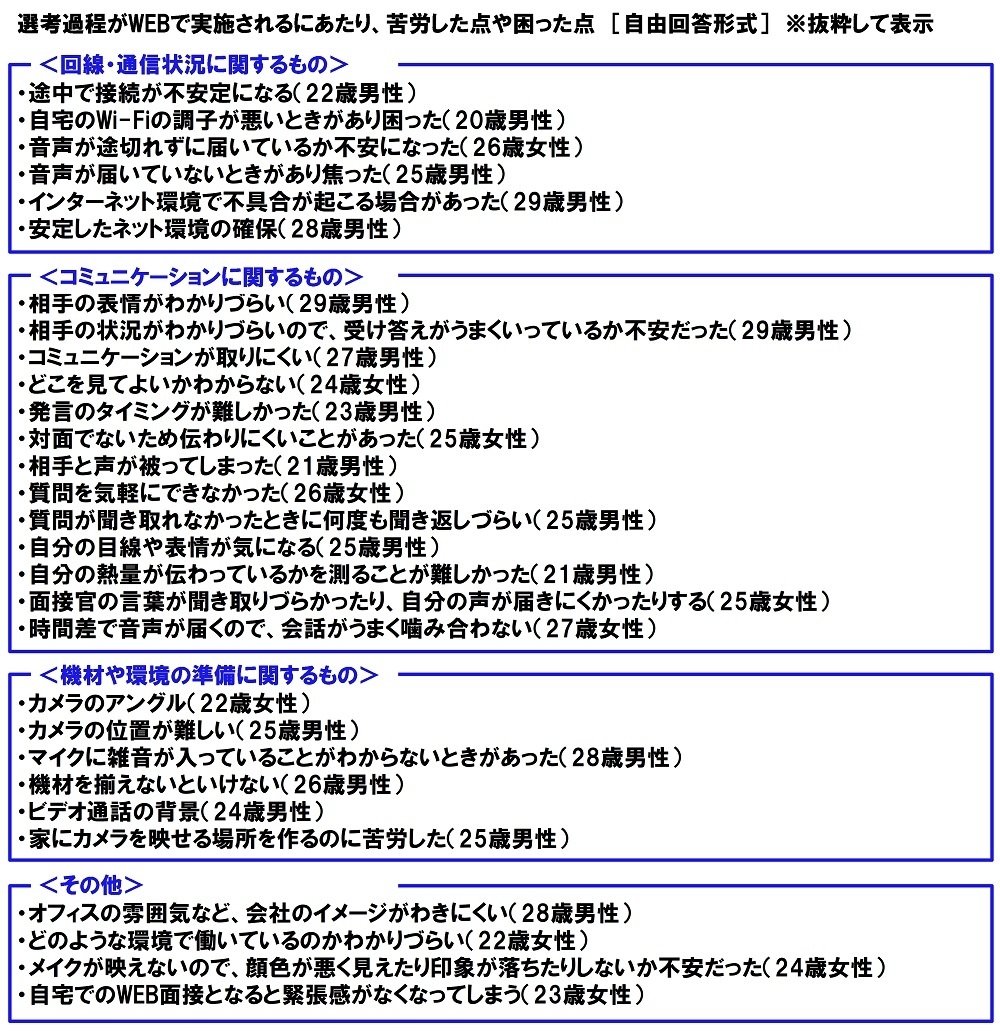 最後に、全回答者(1,000名)に、選考過程がWEBで実施されるにあたり、苦労した点や困った点を聞いたところ、「途中で接続が不安定になる」や「自宅のWi-Fiの調子が悪いときがあり困った」、「音声が途切れずに届いているか不安になった」、「インターネット環境で不具合が起こる場合があった」、「安定したネット環境の確保」など、回線・通信状況に関するものが多くみられました。
