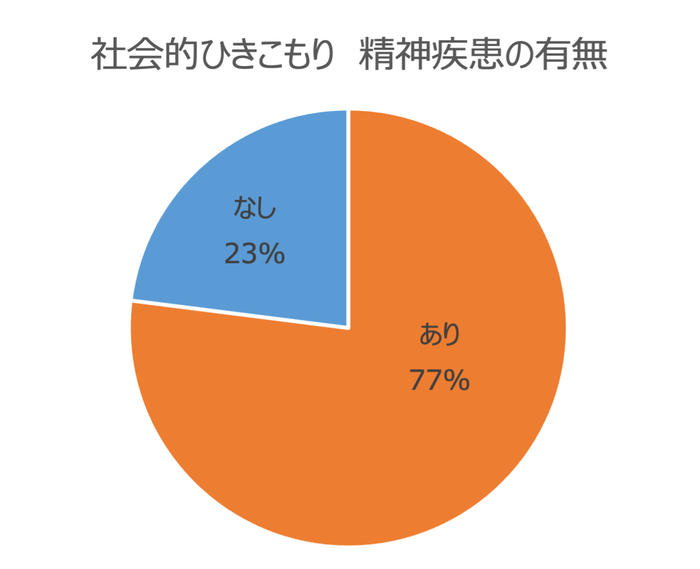 九州大学医学研究院精神病態医学分野 准教授 加藤隆弘医師の研究*3によると、ひきこもり当事者に多い精神疾患は回避性パーソナリティ障害・うつ病・PTSD・社交不安症で、全体の77%が何らかの精神疾患を罹患していました。また、多くのひきこもり当事者(78%)が、ひきこもり打開のための何らかの治療を望んでおり、薬物療法よりも精神療法(カウンセリング)を希望する人が多いことがわかりました。