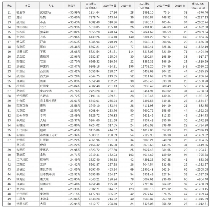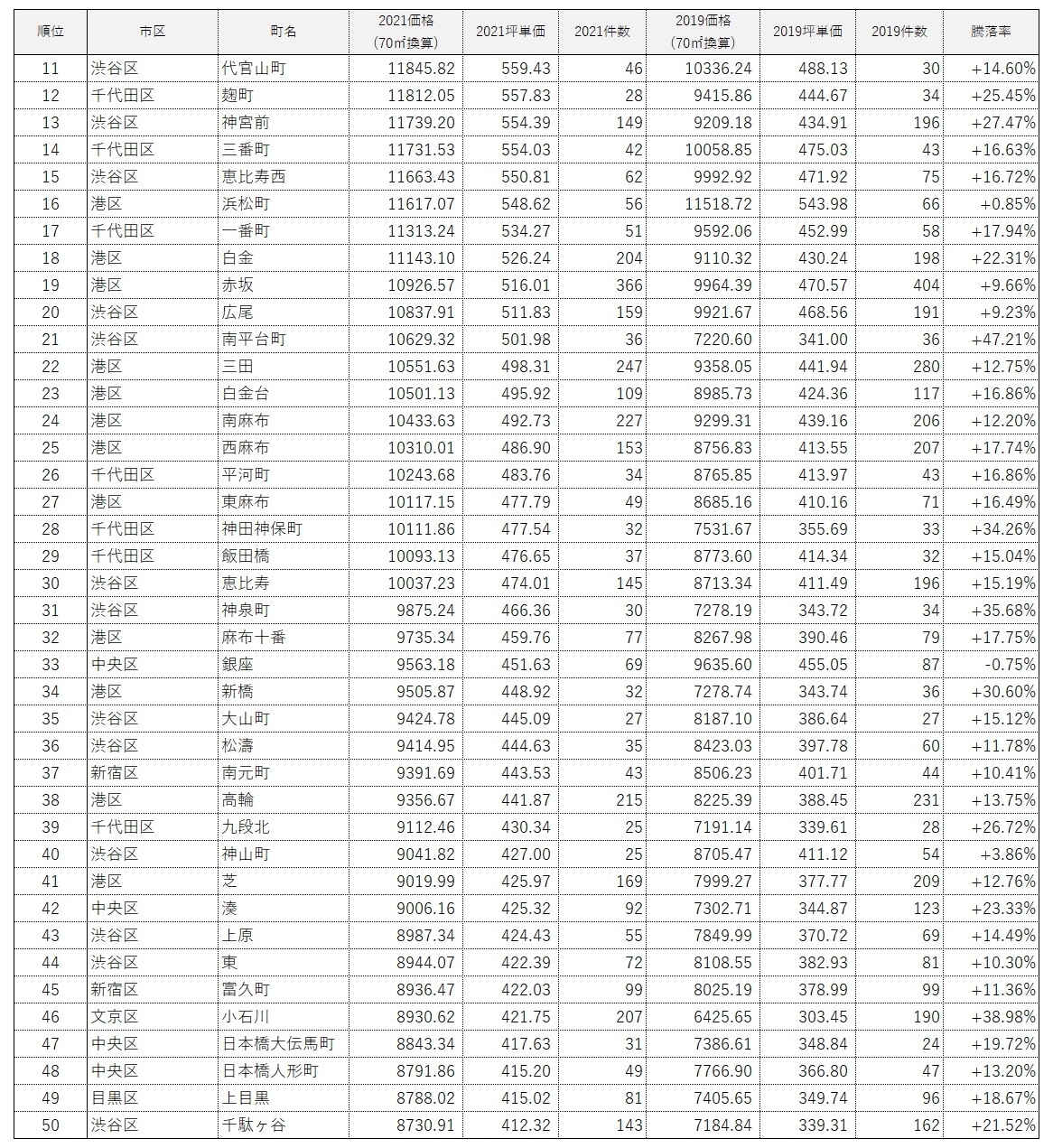 ・1位は「渋谷区宇田川町」の+58.29%。70㎡換算推定価格は1億3,461万9,400円で、コロナ前の2019年と比較して約5,000万円上昇。2020年竣工の「パークコート渋谷ザ タワー」が相場を大きく牽引した。