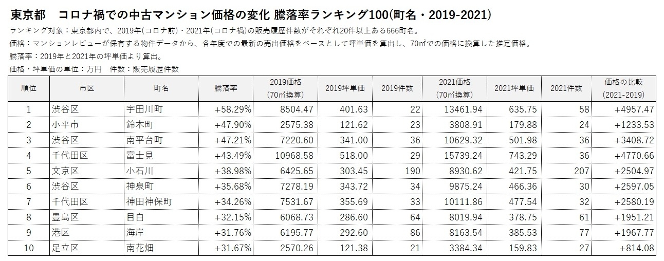 ■東京都 コロナ禍での中古マンション価格 騰落率ランキング100 (町名・2019-2021)