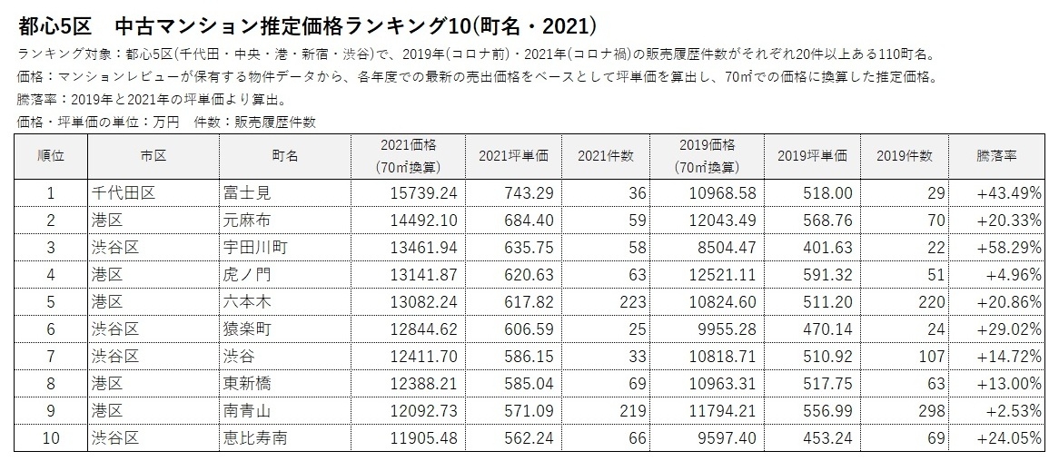 「マンションレビュー」のデータで見る「コロナ禍での東京 中古マンション相場推移」 騰落率&推定価格の町名ランキングを発表