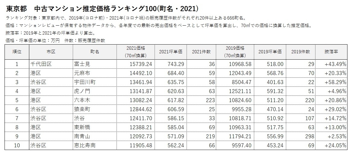 ■東京都 中古マンション推定価格ランキング100 (町名・2021)
