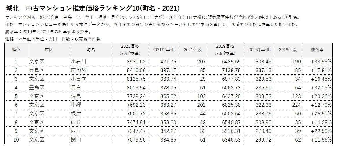 「不動産×WEB×ビッグデータ」の領域で、さまざまな不動産テックサービスを展開する株式会社ワンノブアカインド(本社:東京都港区、代表取締役社長:川島 直也、以下当社)は、当社が運営するマンション情報サイト「マンションレビュー」の保有データを元に、いわゆる「コロナ禍」での東京都の中古マンション価格1の変動について調査。新型コロナウイルス感染症の発見・影響が出る前の2019年と、感染拡大から1年が経過した2021年の坪単価を元に、価格の上昇率をあらわす「騰落率」を「町名」単位で集計したランキング2について、推定価格のランキングとあわせて発表いたします。