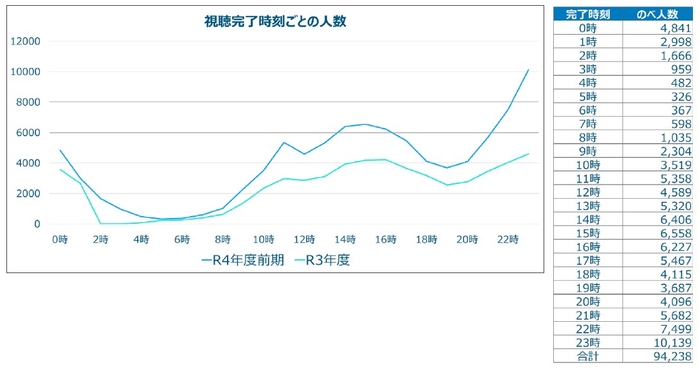 どの時間帯に視聴している学生が多いかを分析したところ、23時台が一番多いという結果が出ました。令和3年度(2021年度)は、メンテナンス作業のため2時~4時は動画の視聴ができませんでしたが、学生からの要望が多数あり、令和4年度(2022年度)からは、24時間視聴可能となるようにシステム改修を行いました。