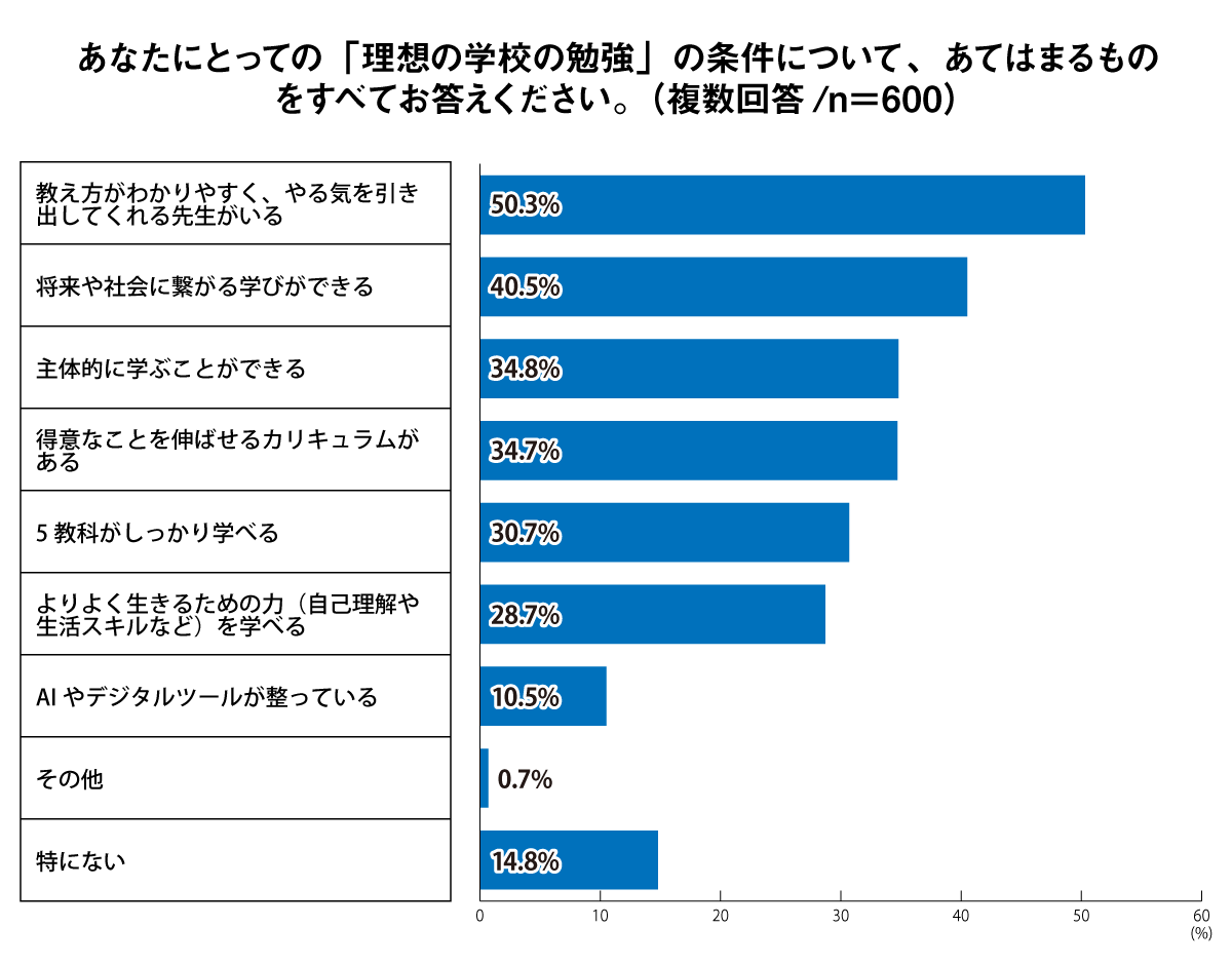 理想的な勉強の条件では「教え方がわかりやすく、やる気を引き出してくれる先生がいる」が最も高く50.3%でした。次いで「将来や社会につながる学びができる」が40.5%、「主体的に学ぶことができる」が34.8%、「得意なことを伸ばせるカリキュラムがある」が34.7%と続きました。