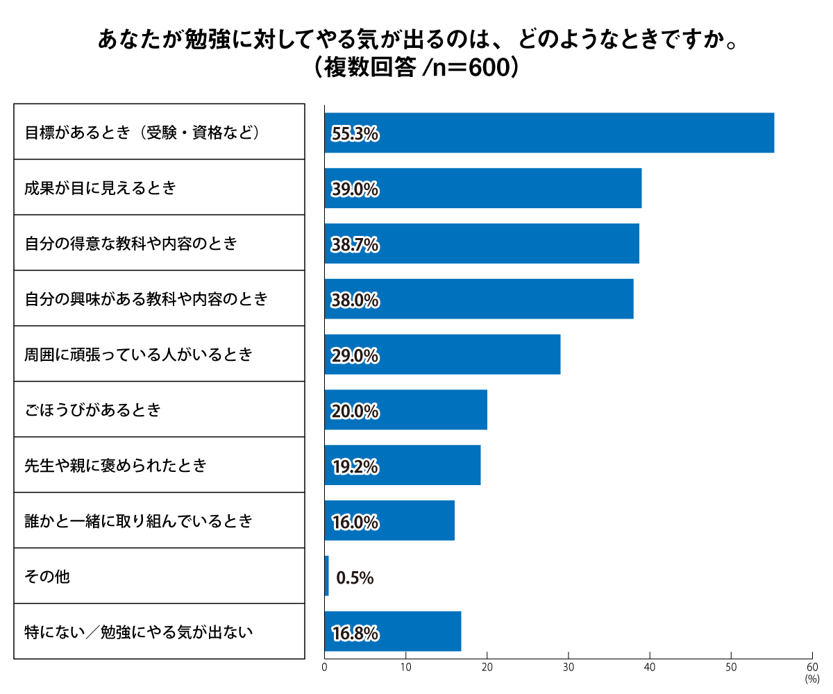 回答率が最も高いのは「目標があるとき(受験・資格など)」で55.3%でした。次いで「成果が目に見えるとき」が39.0%、「自分の得意な教科や内容のとき」が38.7%、「自分の興味がある教科や内容のとき」が38.0%と続きました。