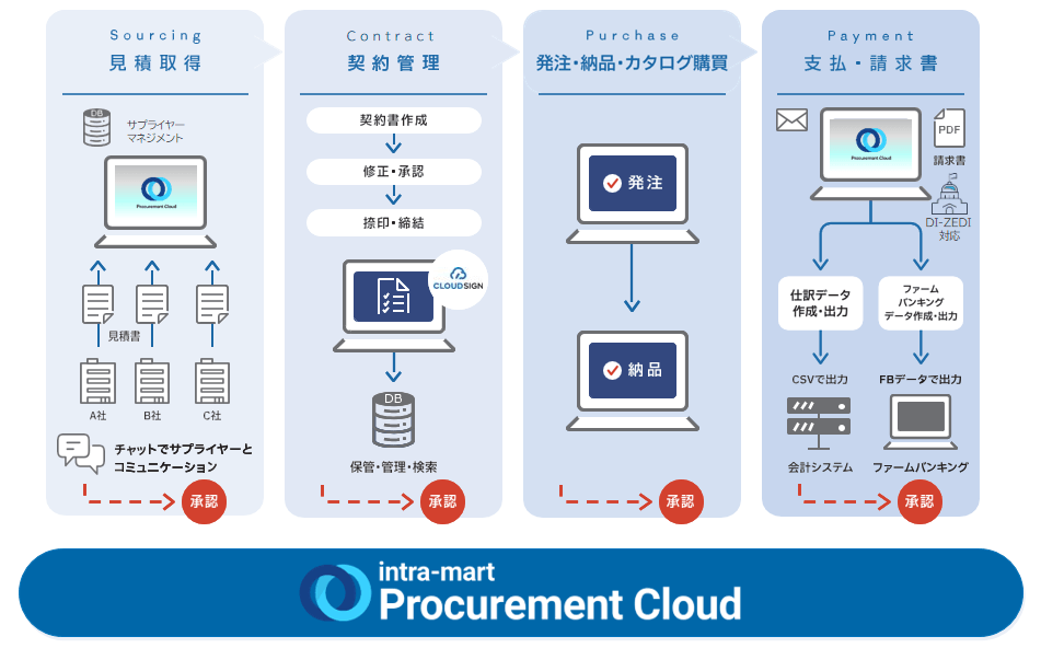 ※1:intra-mart Procurement Cloudは、購買管理・契約ライフサイクル管理・支払管理機能を備え、見積取得・発注納品・請求・支払までワンストップで可能とし、調達・購買活動全体の効率化、ガバナンスの強化、法令への対応を実現するクラウドサービスです。