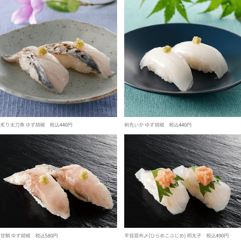 夏3弾では、「太刀魚」や夏2弾に引き続き「甘鯛」や「剣先いか」も入荷し、様々な期間限定のネタを入荷いたします。にぎり長次郎では、お寿司のトッピングが豊富なことが特徴です。ピリッとした中に爽やかさを感じるゆず胡椒(こしょう)や、明太子のトッピングは夏の期間限定となりますので、ぜひご賞味ください。