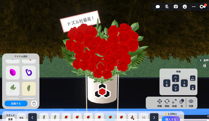 本機能は台座・装飾パーツ・メッセージを自由に組み合わせ、自分だけのフラワースタンドをデザインできるバーチャル空間ならではの推し活体験ができる機能です。作成は無料で、「外観エリア」内に設置されたバーチャルフラワースタンド作成エリアにて、どなたでもご利用いただけます。ファンの皆さまからのお祝いや応援の気持ちを込めた、オリジナルのフラワースタンドをぜひご制作ください。