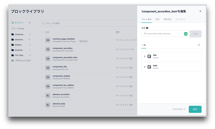 次に、コンポーネント化されたページのパーツ管理機能があります。これにより、ページ内で使用する各パーツをコンポーネントとして管理し、柔軟にページを構築することができます。また、ブロックライブラリを利用することで、様々なプロジェクトの要件に合わせたカスタマイズや拡張が行えます。ページを構成する要素をブロックとして登録し、それを組み合わせてページを作成する流れは、開発の効率化に大いに貢献しています。