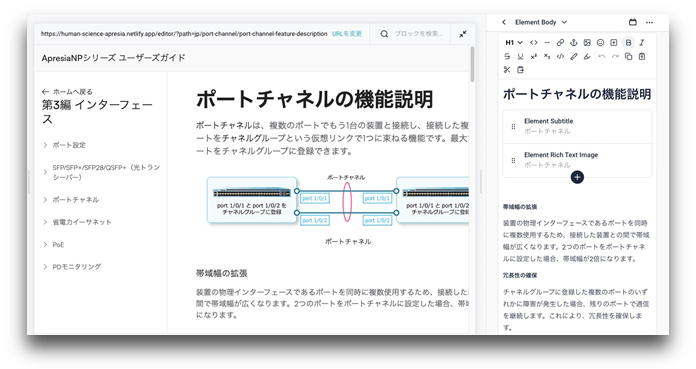 Storyblokはこうした特徴により、高度にコンポーネント化したページを自由にさわりたい場合、LPやキャンペーンページなどの速やかに作成するニーズがある場合、技術ドキュメントのようにバージョンアップに合わせた陳腐化が起こりやすいコンテンツの制作、などに向いていると言えるでしょう。コンテンツのアップデートが頻繁であるなら、リアルタイムで編集中の内容がどのようにページに影響を与えるかをすぐに確認できるのは非常に便利だと感じるはずです。ブロックライブラリによってページの構成要素を組み合わせる自由度が高いことも満足度の高さに繋がっています。
