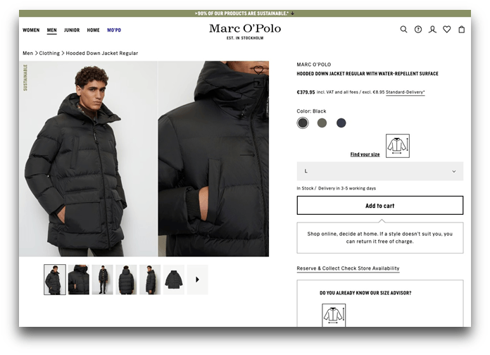 Storyblokは高度なカスタマイズ性と再利用性を持つヘッドレスCMSであるため、常に新しいコンテンツを追加し続ける必要があるサイトに役立ちます。例えば、大量の商品情報を扱うEコマースサイトにおいても、その強力なCMS機能を活かしやすいでしょう。北欧のアパレル大手Marc O'PoloはStoryblokのイベントでよくケーススタディとして取り上げられますが、実際にサイトを確認してみると、商品ページなどのカスタマイズが非常に高度であることが読み取れます。