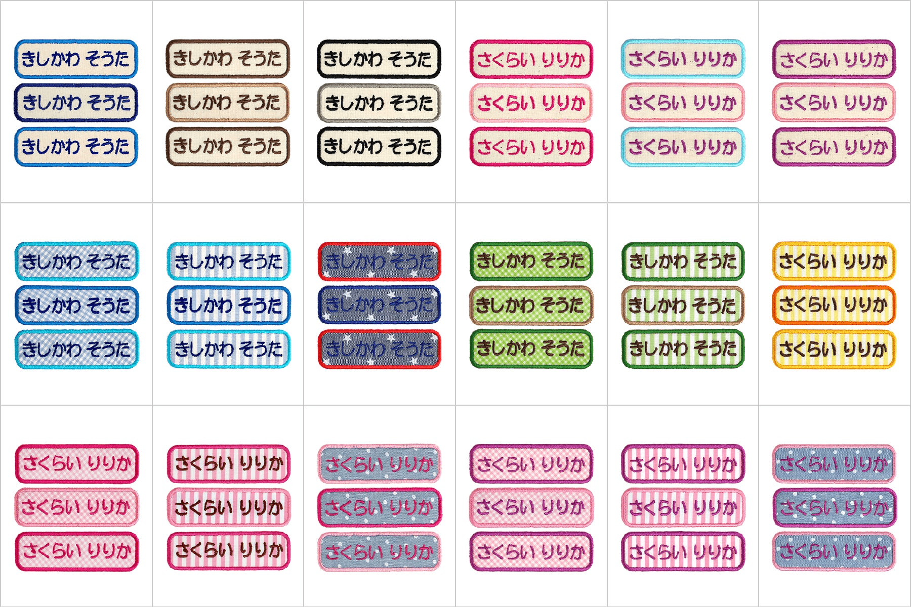 同じ生成生地、パターン生地を使用した、サイズ違いのお名前ワッペンです。