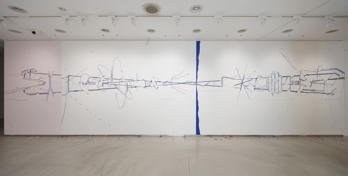 1981年北海道生まれの盛は、現在パリを拠点としてBug report(線の起源を糸とする仮説から、これまで糸によるドローイングシリーズ)を展開してきました。盛が『衣を家に例えると、糸は建材を司る』と言うように、糸のドローイングには建築設計図のように緻密で幾何学的な形状が現われます。