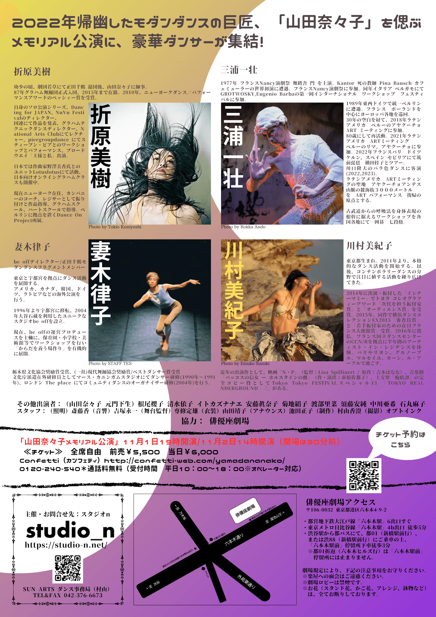 生前の山田奈々子と所縁のあったモダンダンス、コンテンポラリーダンス、舞踏のダンサーが、山田奈々子の名作や山田奈々子に捧げる新作を上演します。