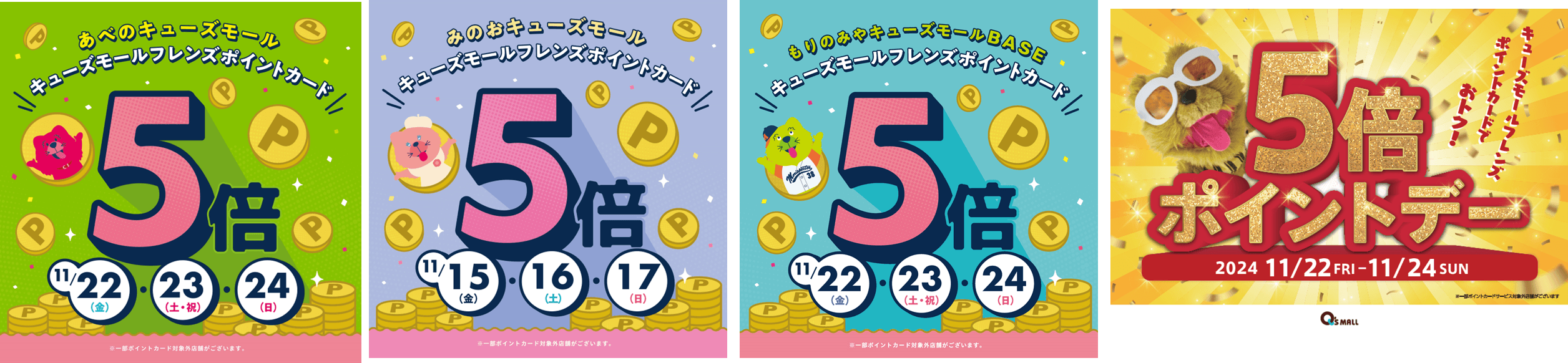 内容:期間中、通常100円(税込)で1ポイント貯まるキューズモールフレンズポイントカードのポイントが5倍となるキャンペーンを実施します。