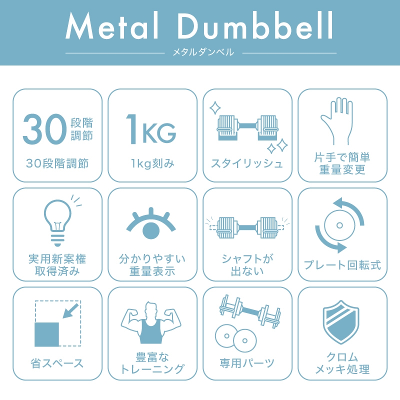 様々な体の部位を鍛えることに加え、ご自身の成長に合わせて、より小刻みに重量変更したいといったお客様の声を反映させた1kg刻みの重量可変式のメタル仕様のダンベルです。