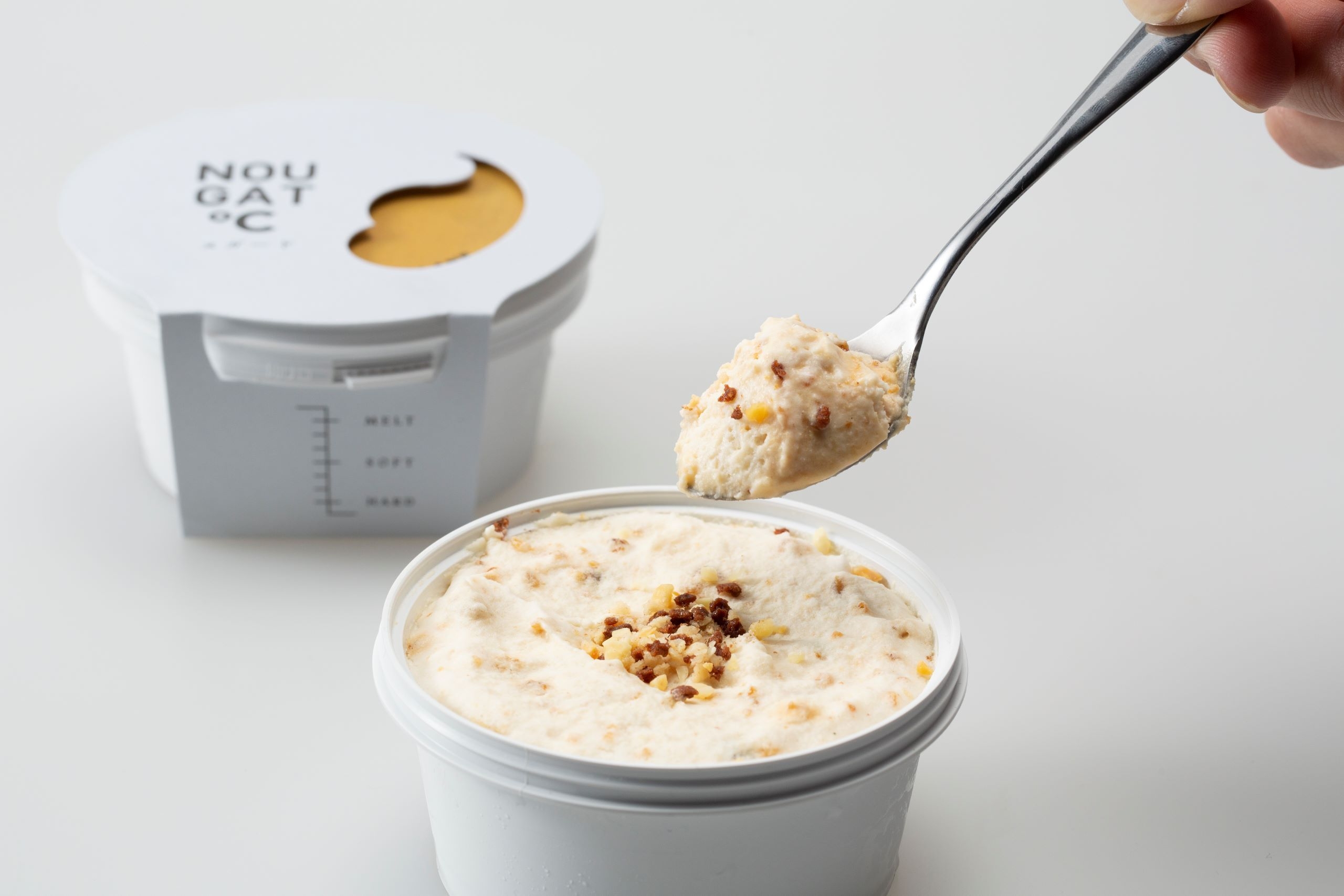 冷凍で届く「ヌガード」は、一見するとアイスクリームのよう。しかし口に入れると、キャラメルナッツの「カリッ」とした歯ざわりや、メレンゲ入りクリームの「ふわっ」と食感、そして口の中で「とろ~り」と溶けていく感覚が広がります。