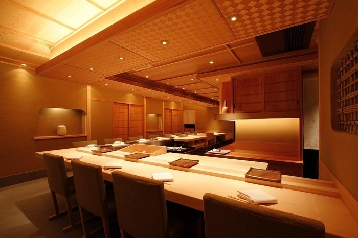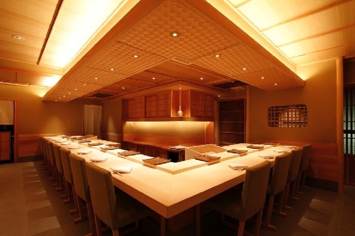 数寄屋風の落ち着いた店内は、今では素材を確保するのも難しい“長さ6mの美しい国産檜一枚板”を使用したL字型カウンターが圧倒的な存在感を放ち、大切な人と特別な時間を過ごすことができます。6名テーブル席の完全個室有り。