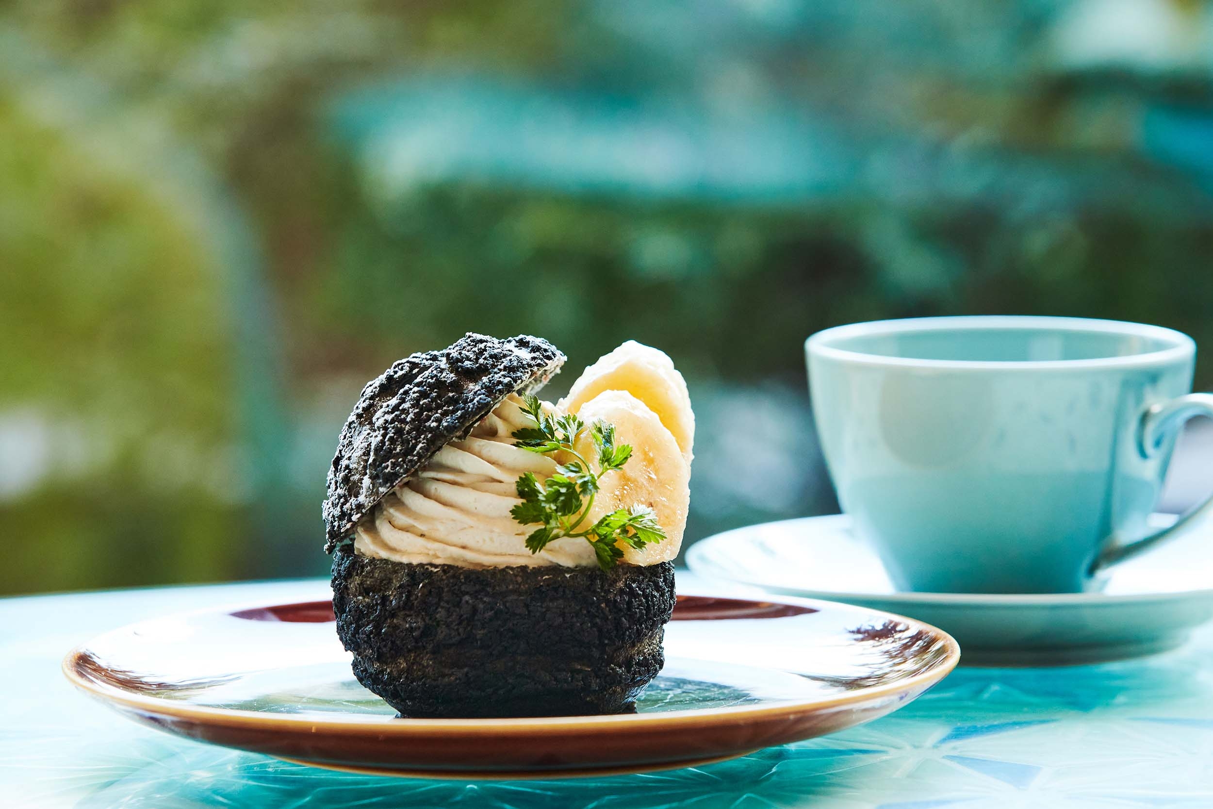 レストラン自慢の薪グリルをイメージし、お茶の香ばしさを楽しめる静岡産の茶炭を使用したユニークな黒いさくさくのシュー生地の中央にたっぷりとクリームを挟んだシュークリームです。茶炭のシュー生地に合わせ、4月、5月の季節特製のクッキーシューをお楽しみいただけます。