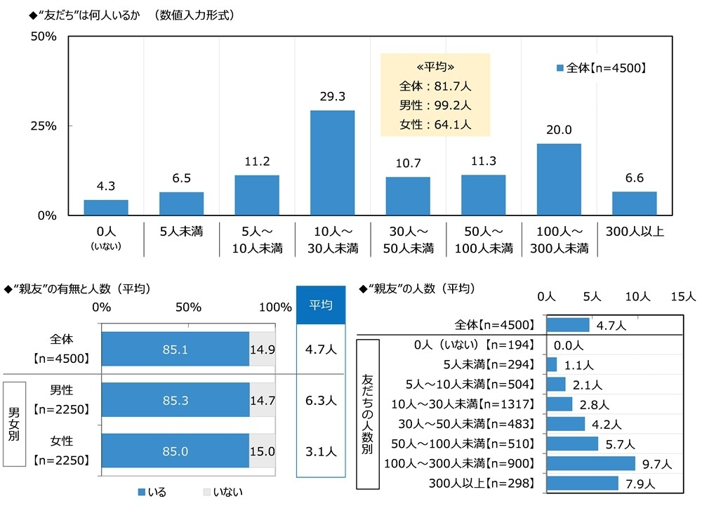 ・“友だち”は何人いる? 平均81.7人、男性では平均99.2人、女性では平均64.1人