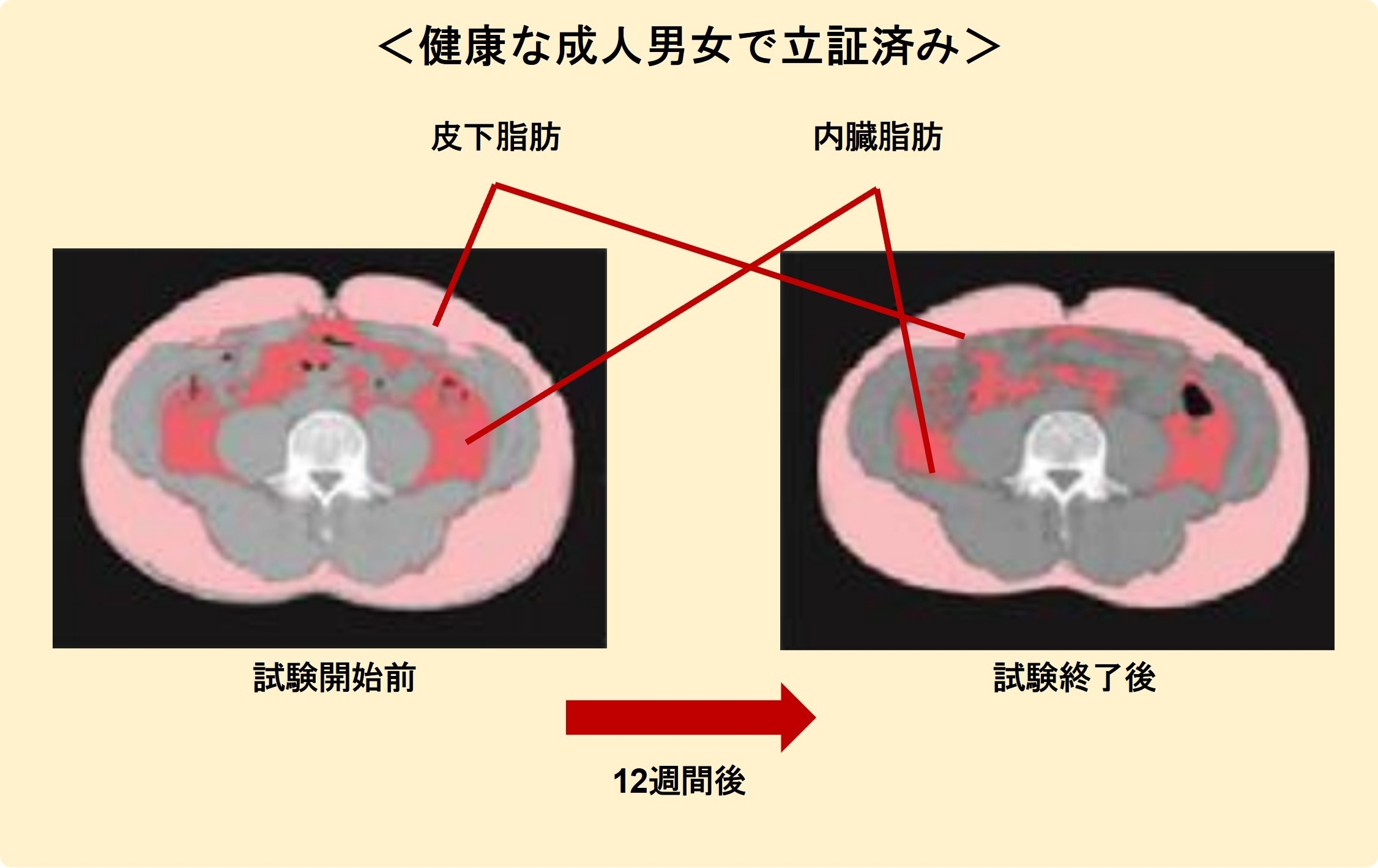 健康な成人男女が12週間毎朝2gのMCTオイルとLCTオイル(調合サラダ油)を含んだ標準的にバランスの取れた食事を摂った結果、LCT群と比べ、MCT群では試験期間中に、継続して体脂肪量と内臓脂肪面積が有意に低下しました。