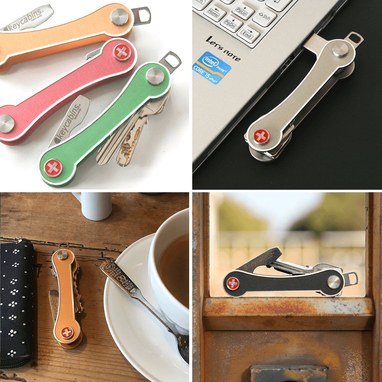 注目すべきは素材。カーボン、アルミニウム、そして、天然木タイプはフローリングになれなかった床材から作られています。(スノーボードとLPレコードから作られたタイプはすでに完売)優れたデザイン性がヨーロッパで高く評価されデザイン賞を受賞。鍵をスイスアーミーナイフのようにスタッキングして収納するので、ジャラジャラしている鍵がスマートな見た目に。また、鍵同士がぶつからなくなるので耳障りなチャリチャリ音から解放されます。