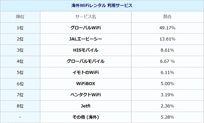 海外Wi-Fiレンタルサービスを利用された方でトップはグローバルWiFiが49.17%と最も高く、次いでJALエービーシーの13.61%、HISモバイルの8.61%となりました。