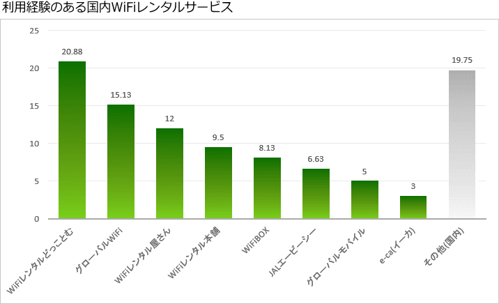 国内Wi-Fiレンタルサービスを利用された方でトップはWiFiレンタルどっとこむが20.88%、次いでグローバルWiFi・国内用が15.13%、WiFiレンタル屋さんの12%となりました。