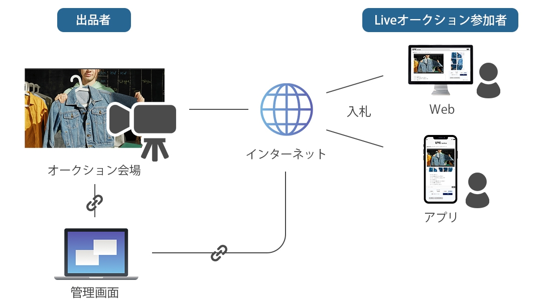 入札・落札などの情報をシステムと連動させることで、現地会場で行われるオークションへネットからも参加できるようになります。既に利用している顧客管理システムや在庫管理システムがある場合は、連携させることで継続して同じシステムを利用した運用も可能です。