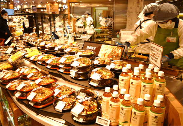 惣菜コーナーではライブキッチンになっており、視覚・聴覚・嗅覚でおいしさをお届けいたします。