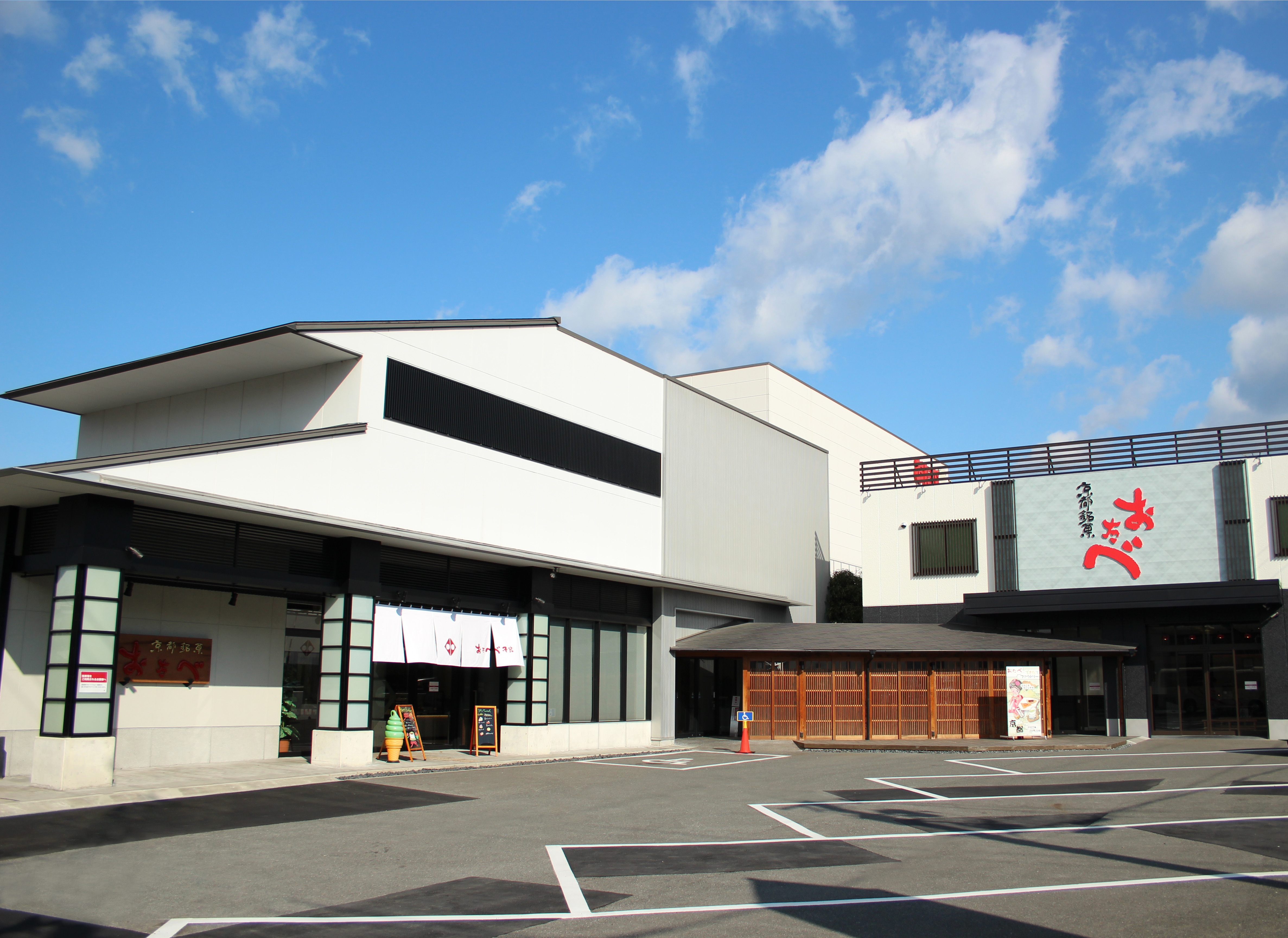 工場に加え「京ばあむ」や店舗限定スイーツの販売、カフェレストランを併設した複合施設です。
