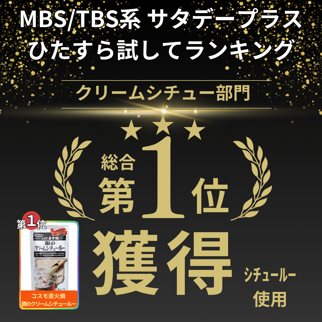 当社の【コスモ直火焼 銀のクリームシチュー・ルー】が、MBS/TBS系『サタデープラス』内「ひたすら試してランキング」の「クリームシチュー」部門において、全体の味・ソースだけの味・ご飯との相性・ルーの溶けやすさ・コストパフォーマンスという全項目で高い評価をいただき、総合第1位を獲得いたしました。