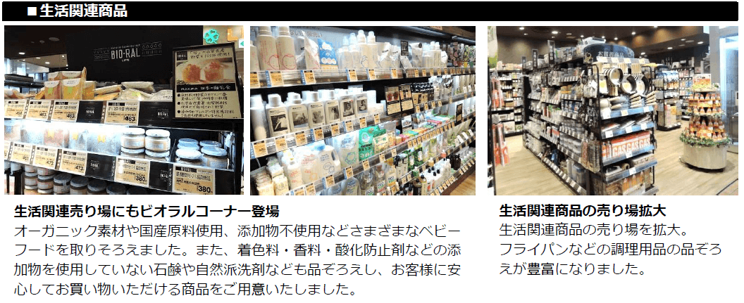 コロナ禍によりさらに高まる健康志向や安全・安心へのニーズにお応えするため、売り場を拡張し「オーガニック・ローカル・ヘルシー・サスティナビリティー」にこだわった商品を展開する大型ビオラルコーナーを導入いたしました。自然の恵みを生かした“オーガニック”商品、埼玉県のおいしい“ローカル”商品、体に優しい“ヘルシー”商品などを豊富に取りそろえ、お客様の心と体の健康と豊かな毎日をお手伝いしてまいります。