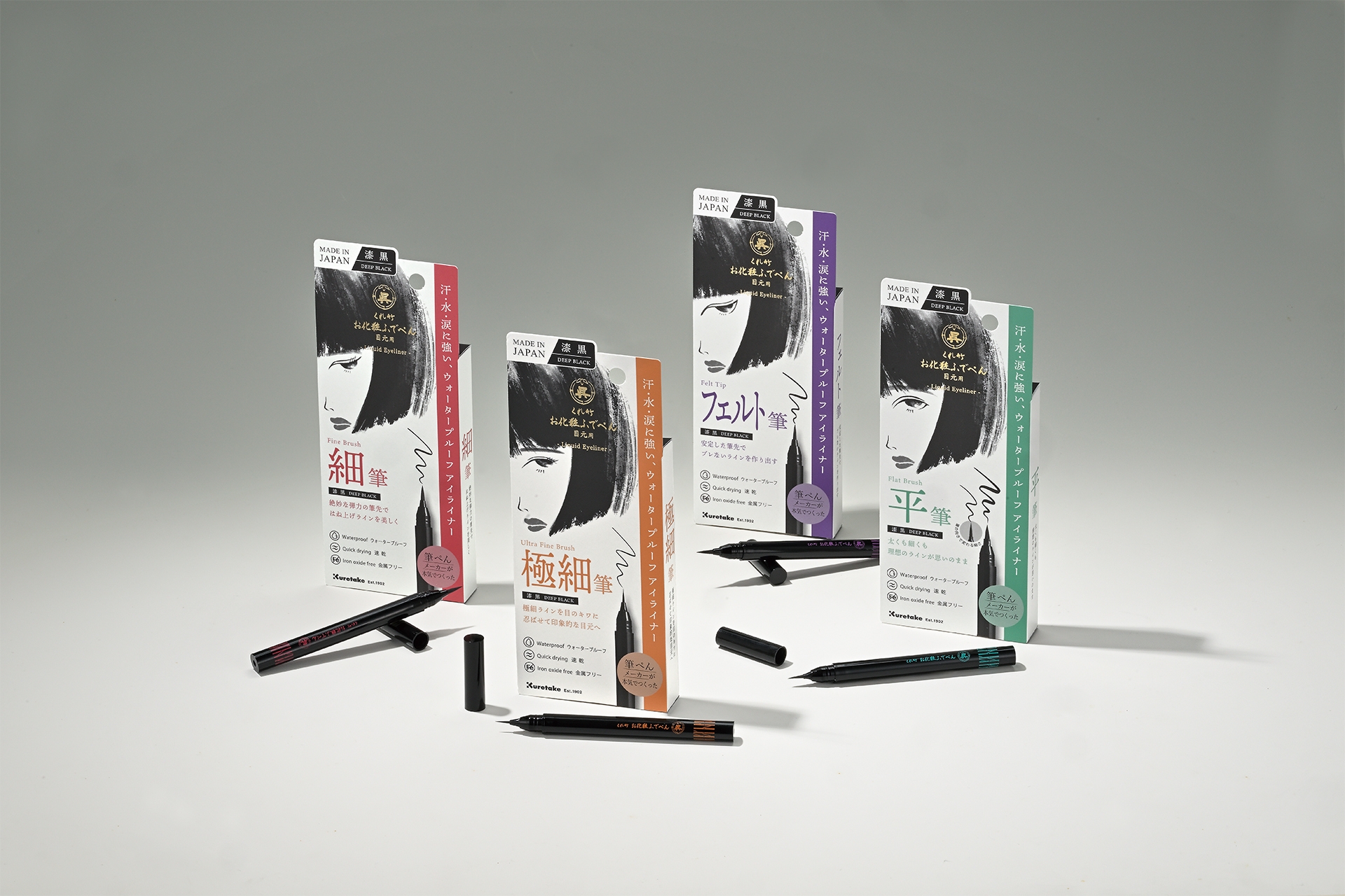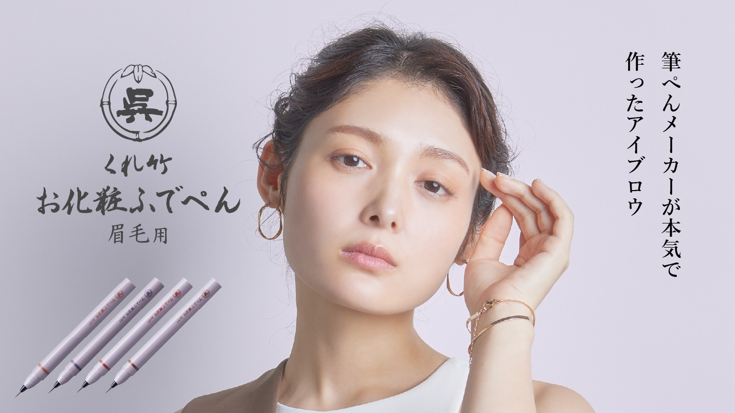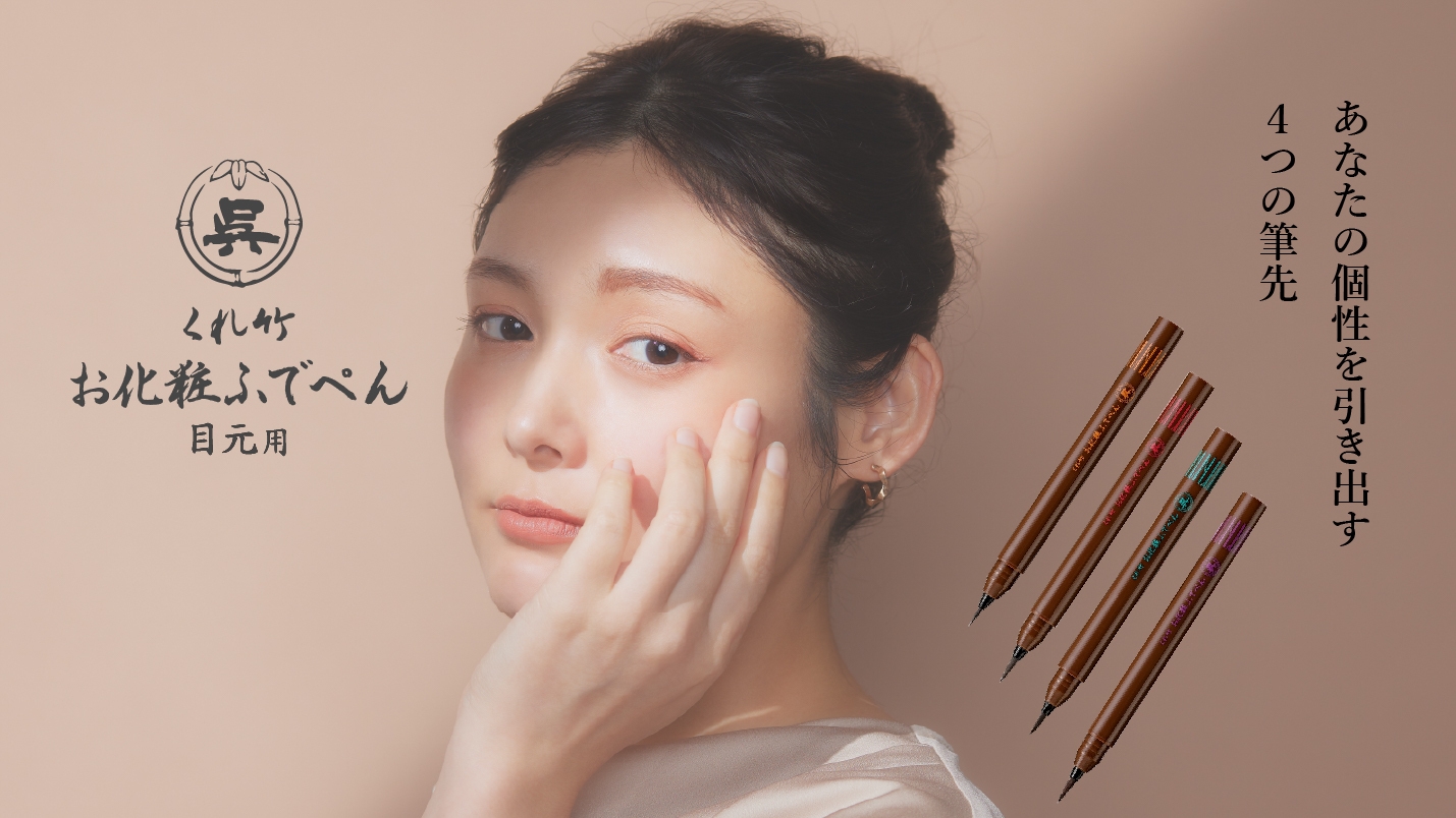 「くれ竹 お化粧ふでぺん」は、創業120年を超える呉竹が届ける、筆ぺんの技術を活かしたコスメブランドです。長年、書道用品や筆ぺん製造を通じて育んだ技術を結集させ、リキッドアイライナー、リキッドアイブロウを開発しました。