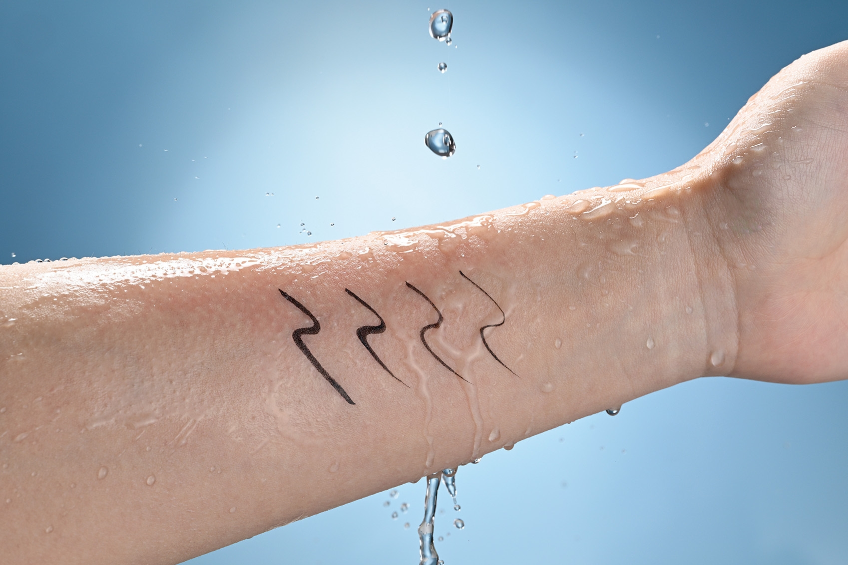 落ちにくさにこだわり、汗・水・涙に強いウォータープルーフとなっています。肌に描いた後は非常に早く乾くため、アイラインを引いたあとすぐにビューラーなど次のメイクに移っていただけます。