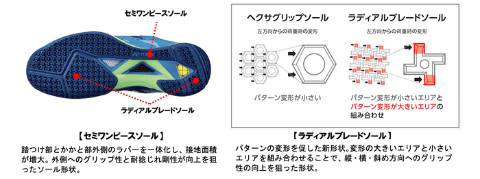 シューズ底は、縦、横、斜め方向へのグリップ性を高める「ラディアルブレードソール」(特許出願中)を設置し、踏付け部とかかと部の外側ラバーを一体化させた「セミワンピース設計」との相乗効果で、グリップ性と着地時の安定性を向上させました。