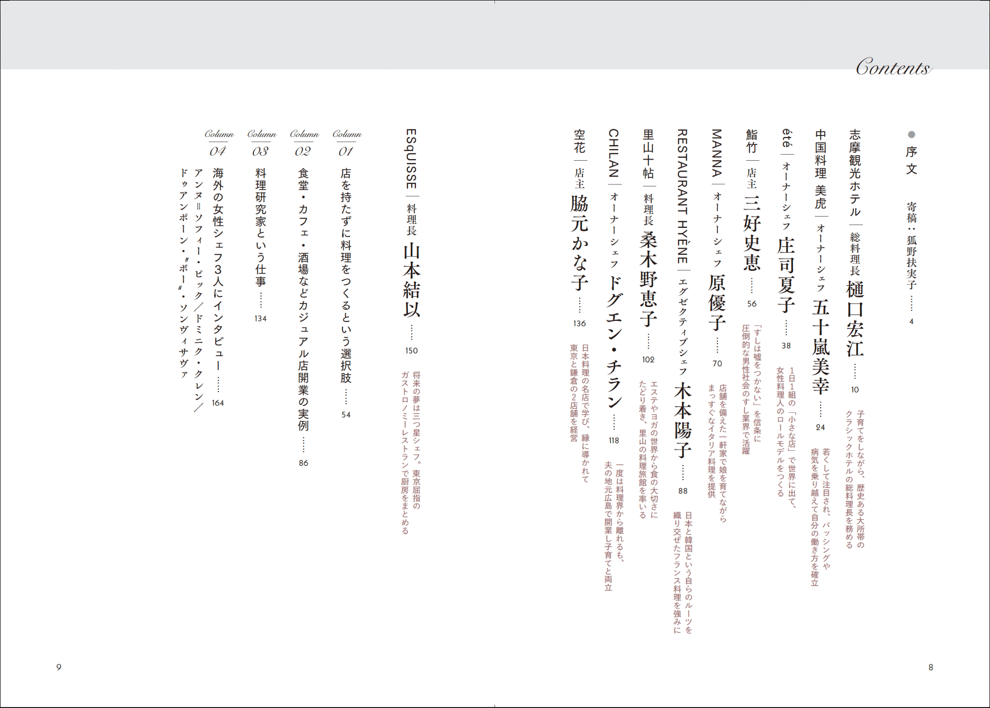 彼女たちのこれまでの歩み、生き方、女性シェフとしての苦悩、店や料理に対する考え、家族についてなどをロングインタビュー。1日のスケジュールやシグネチャーディッシュのレシピ、美しい料理写真、想い出の写真など、余すことなく紹介します。コラムでは「海外の女性シェフ3人にインタビュー」と題して、フランス、アメリカ、タイの3国で活躍するトップシェフのインタビューなどを掲載。店を持たない料理人や料理研究家の事例についても紹介します。