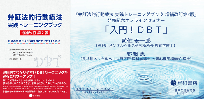 日本公認心理師ネットワークが、2025年6月14日10時00分から12時00分まで、『弁証法的行動療法 実践トレーニングブック 増補改訂第2版』発売記念オンラインセミナー「入門!DBT」というテーマでオンラインセミナーを開催します。