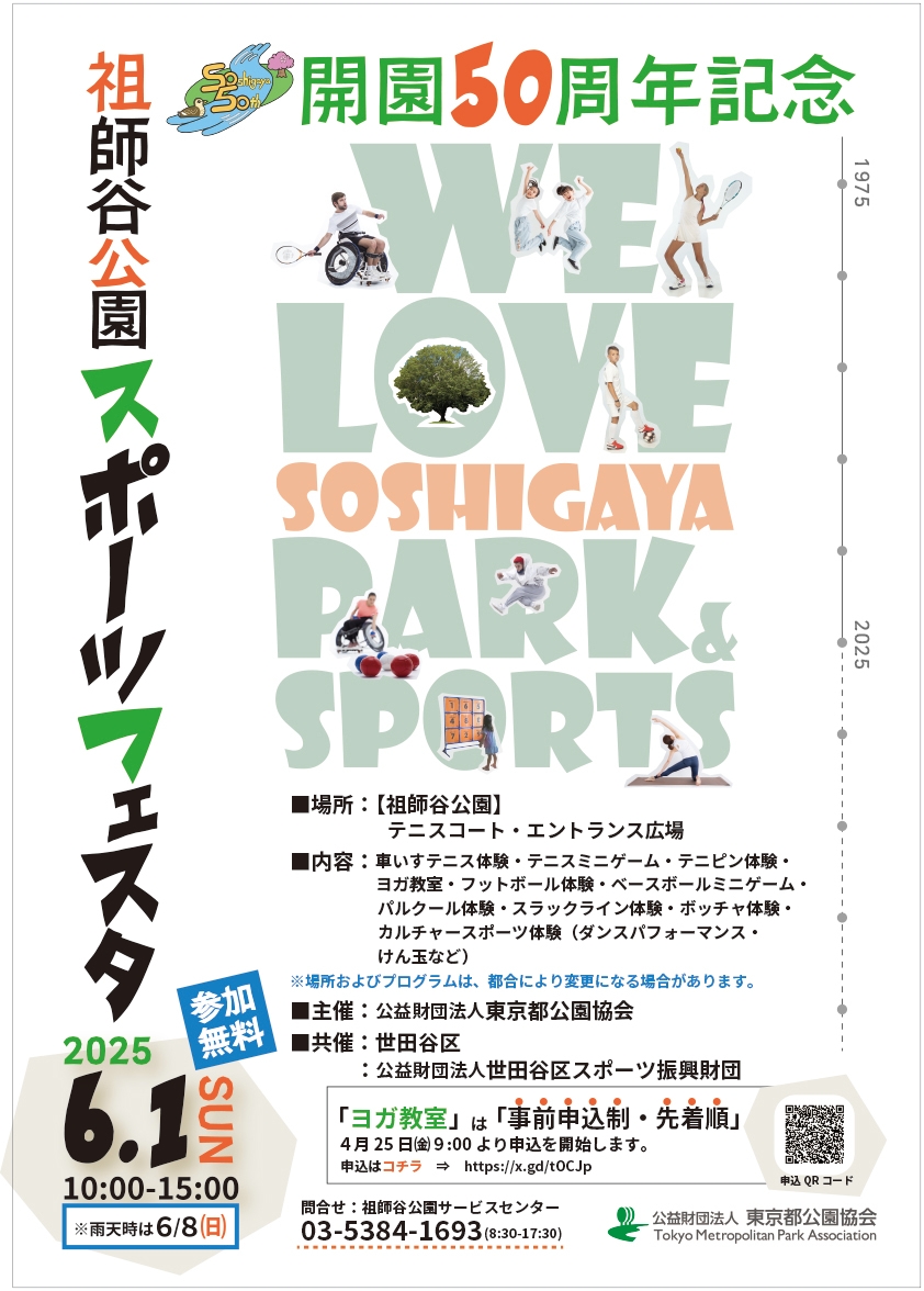 昭和50年(1975年)に旧東京教育大学農場跡地を中心に開園した祖師谷公園は、令和7年(2025年)開園50周年を迎えます。50周年を記念して、開園日である6月1日(日)に、「祖師谷公園スポーツフェスタ」を開催いたします。
