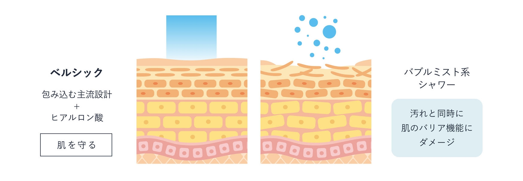 肌の潤いを保つために必要な角質層内の天然保湿成分や表面の皮脂などを削ぎ落すことのない最適な水流設計でやさしく肌を包み込みます。
