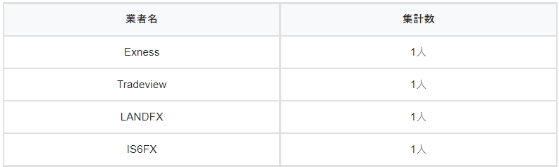 Exnessは最近少しずつ人気が出ている業者ですが、今回は意外に1人から名前が出ただけとなります。