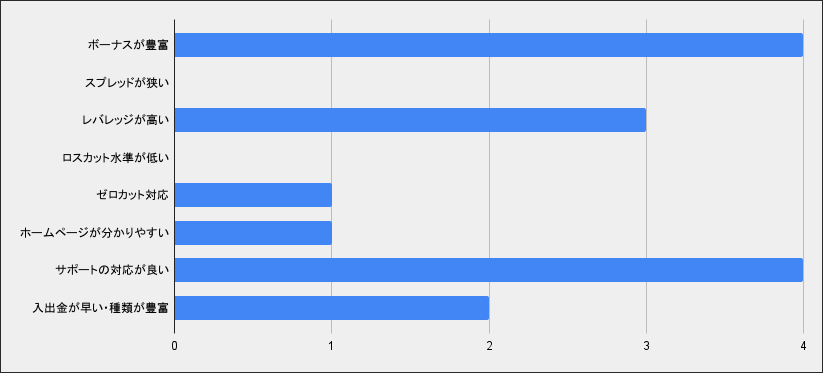 FXGTを選んだ人は「ボーナスが豊富」な点や「サポートの対応が良い」にチェックを入れている人が多かったです。