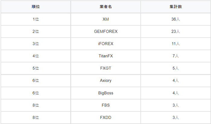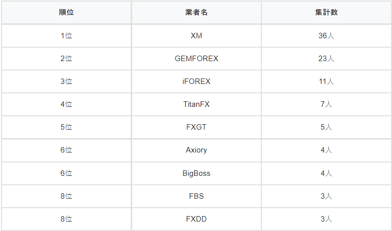 100人の海外FXトレーダーにアンケートを取った結果、1位はXMで36人、2位はGEMFOREXで23人、3位はiFOREXで11人の結果となりました。